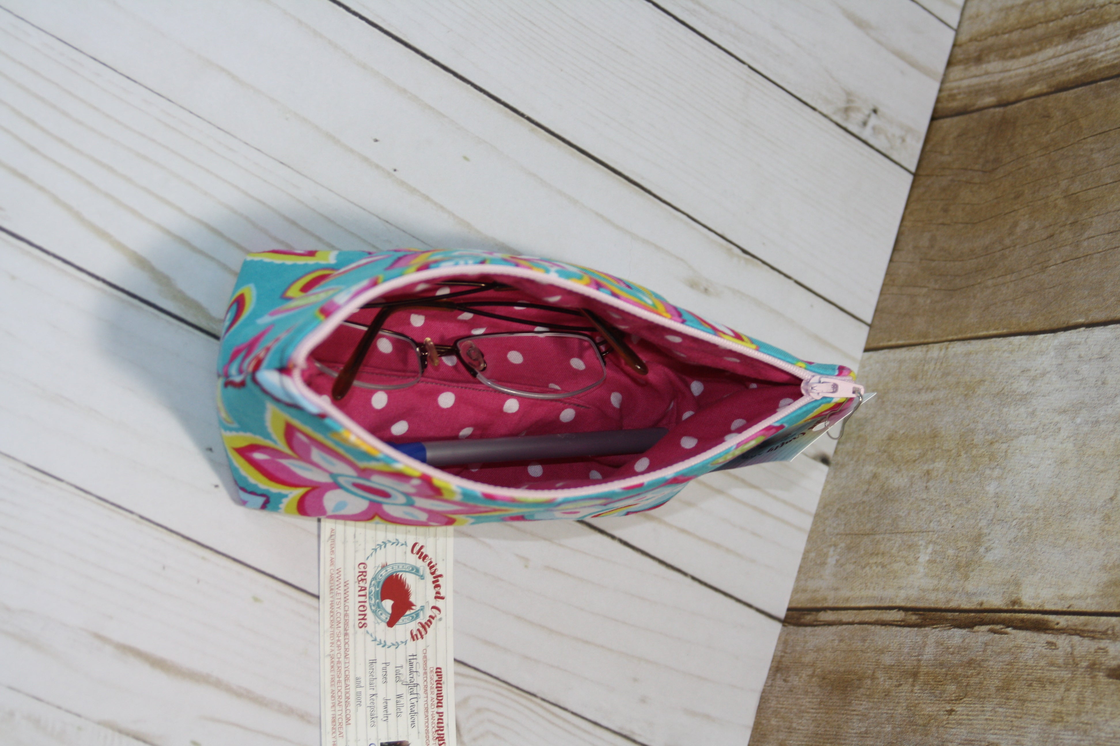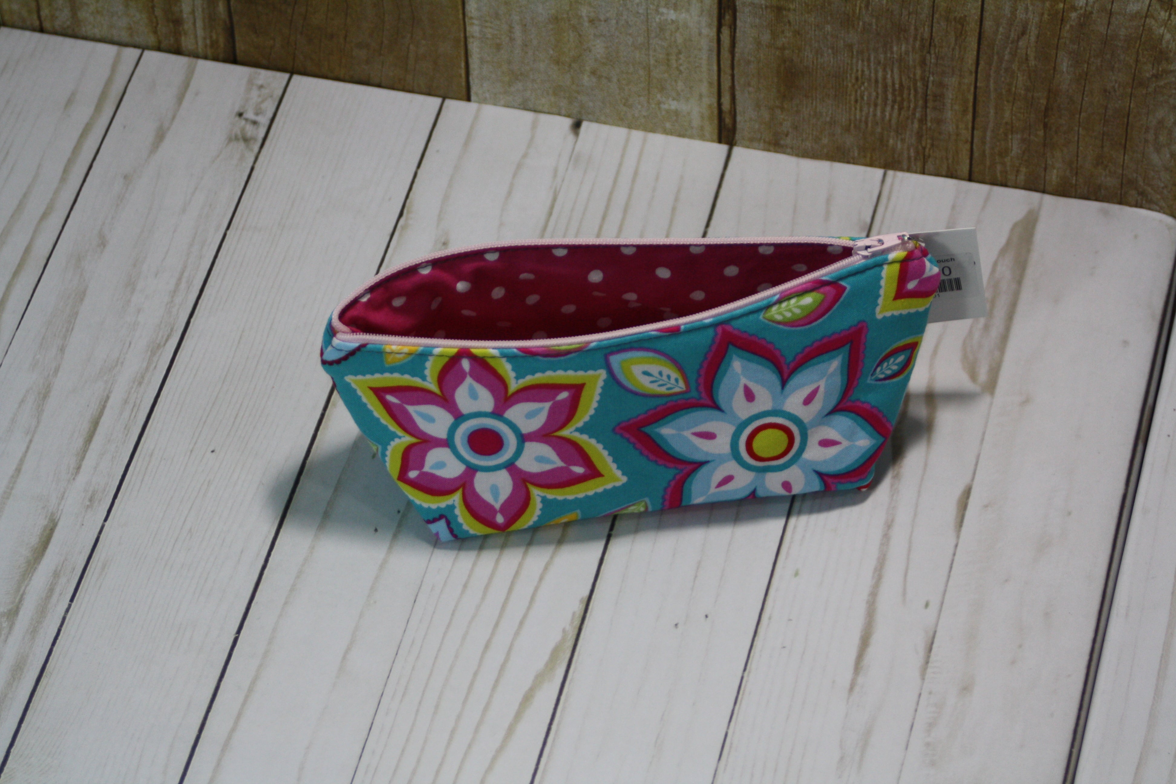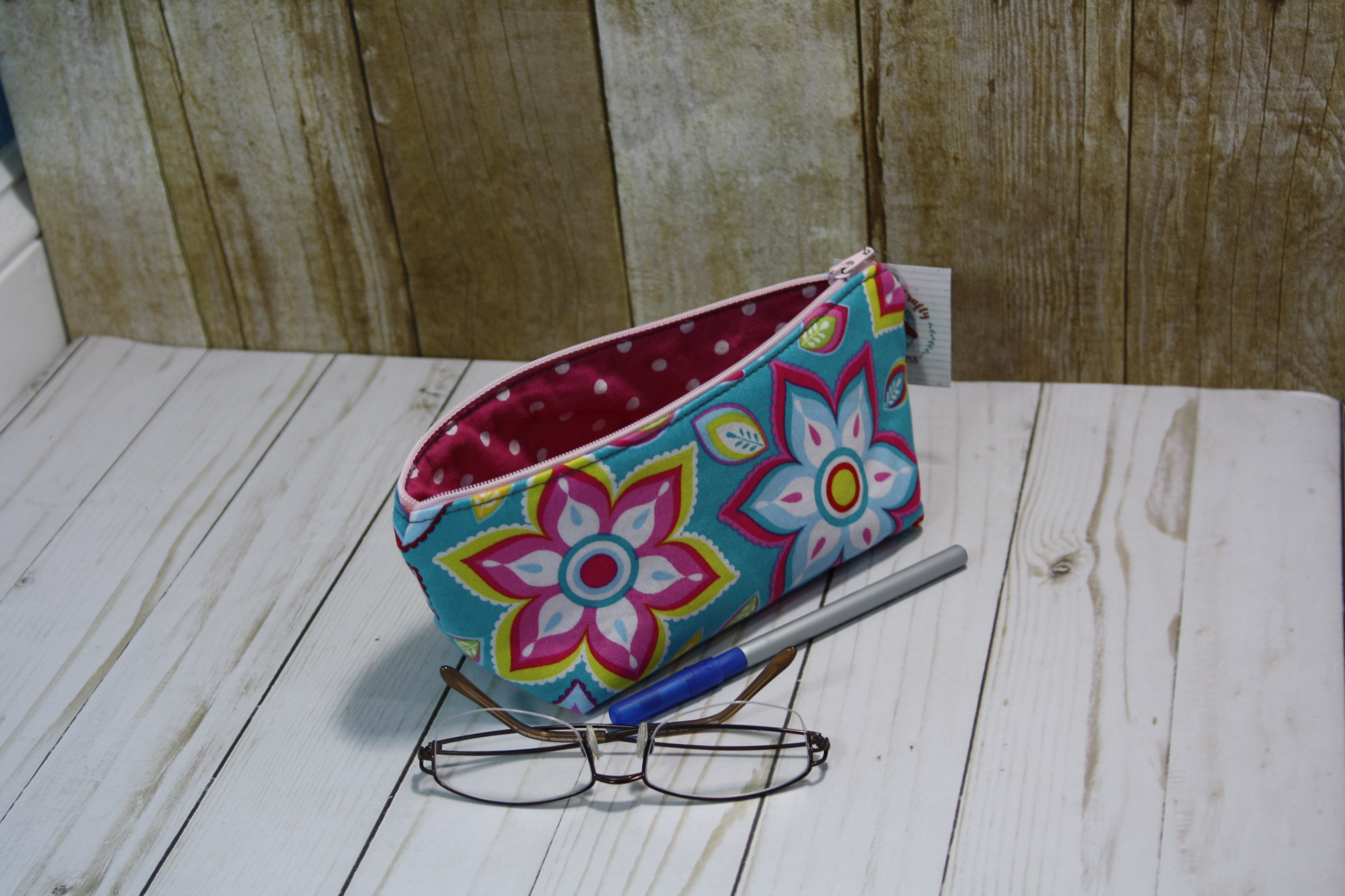Handcrafted Medium Boxy Bottom Zipper PouchThis pouch is lightly padded and large enough to hold unfolded cash, checkbooks, pens, and more! Fill it up and toss it in your purse or...