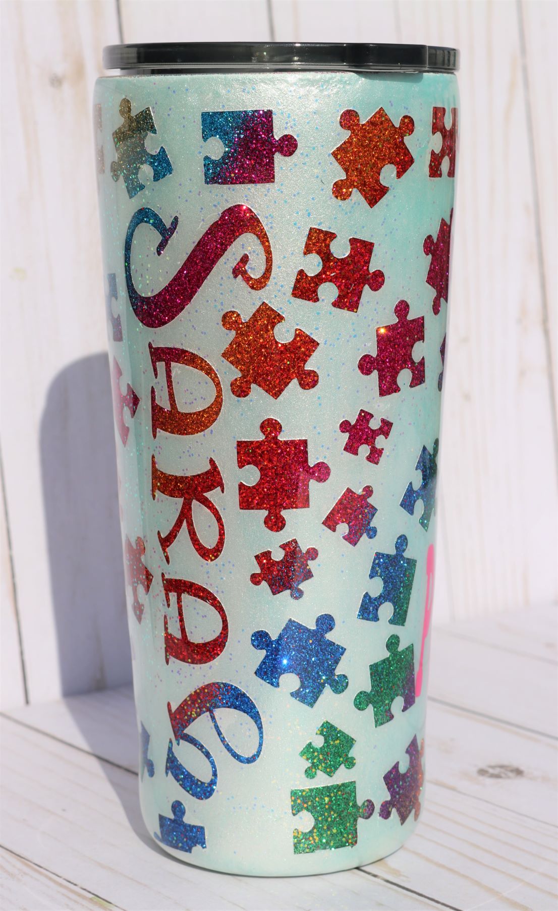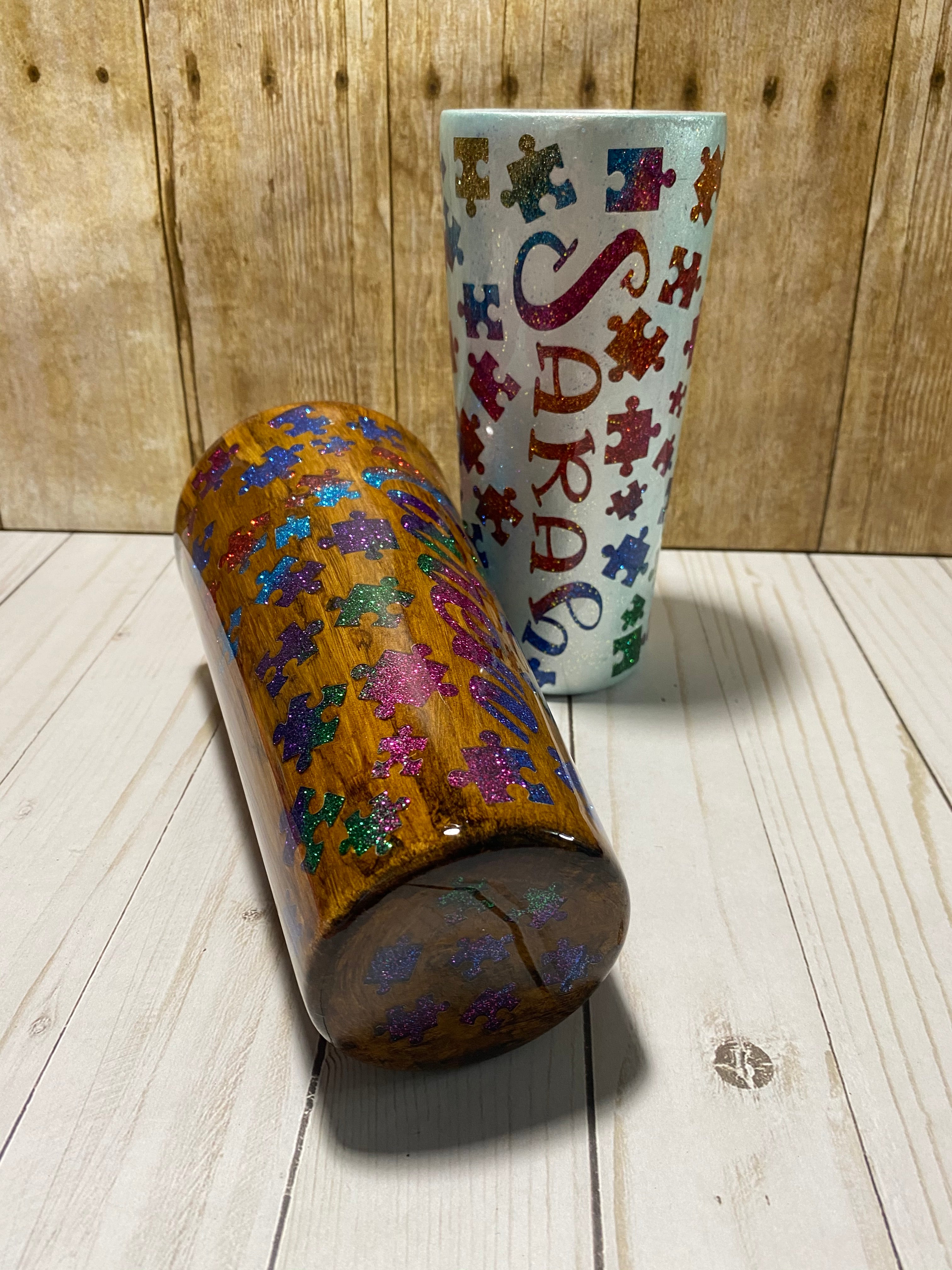 The puzzle tumbler is a peek a boo style where the base is glitter which shows through at the end.  The next is alcohol inks or mica powder (depending on the look you are going for) and then a topping of glitter mixed into the epoxy on top of that to give a little extra sparkle! You can choose to leave out the top sparkle if you prefer.  After that is done and dry, the tumbler is sanded, decals added, and another layer of epoxy is added to give that smooth glasslike feel.