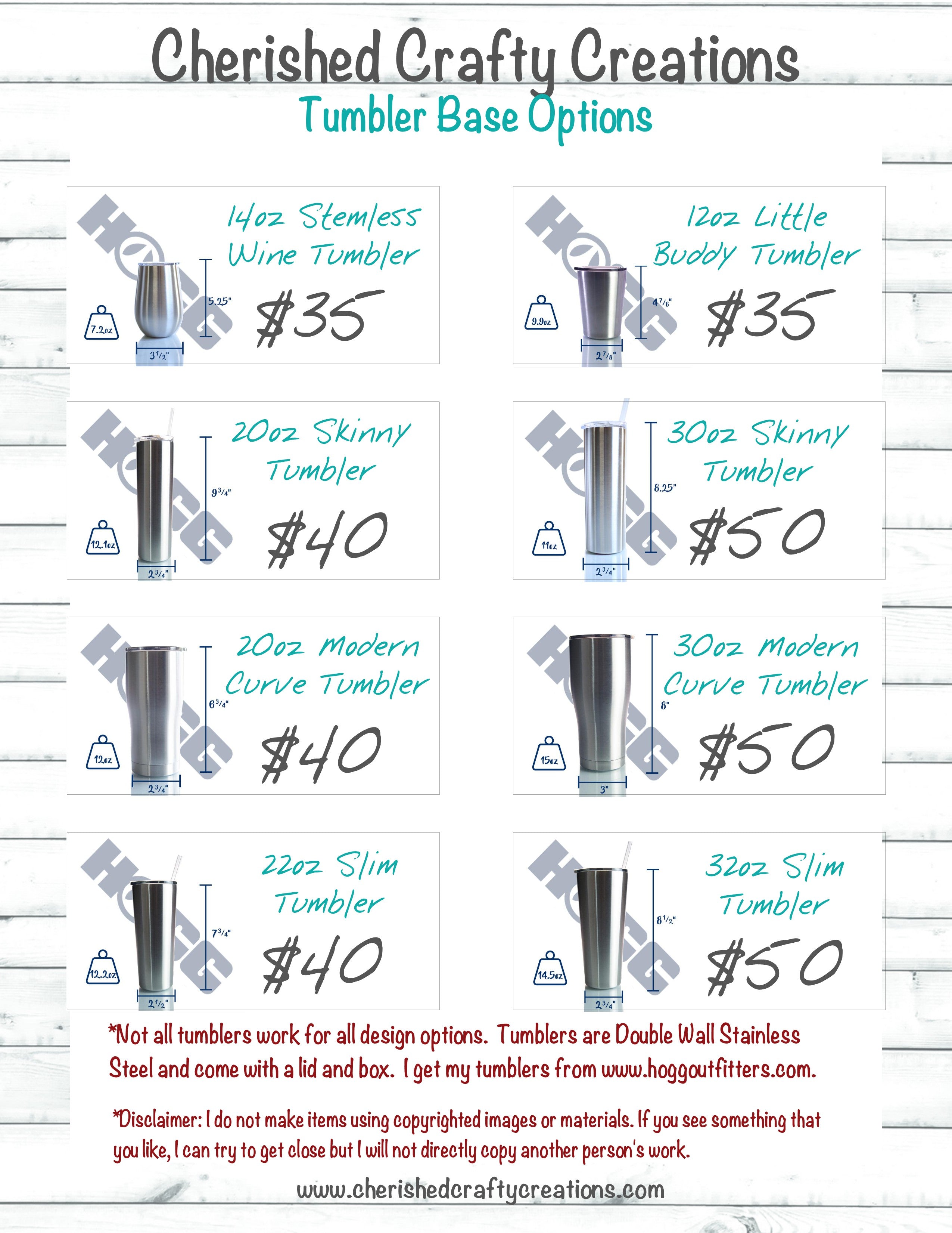 14oz wine tumbler, 12oz little buddy tumbler, 20oz skinny tumbler, 20oz modern curve tumbler, 22oz slim tumbler, 30oz skinny tumbler, 30oz modern curve tumbler, 32oz slim tumbler