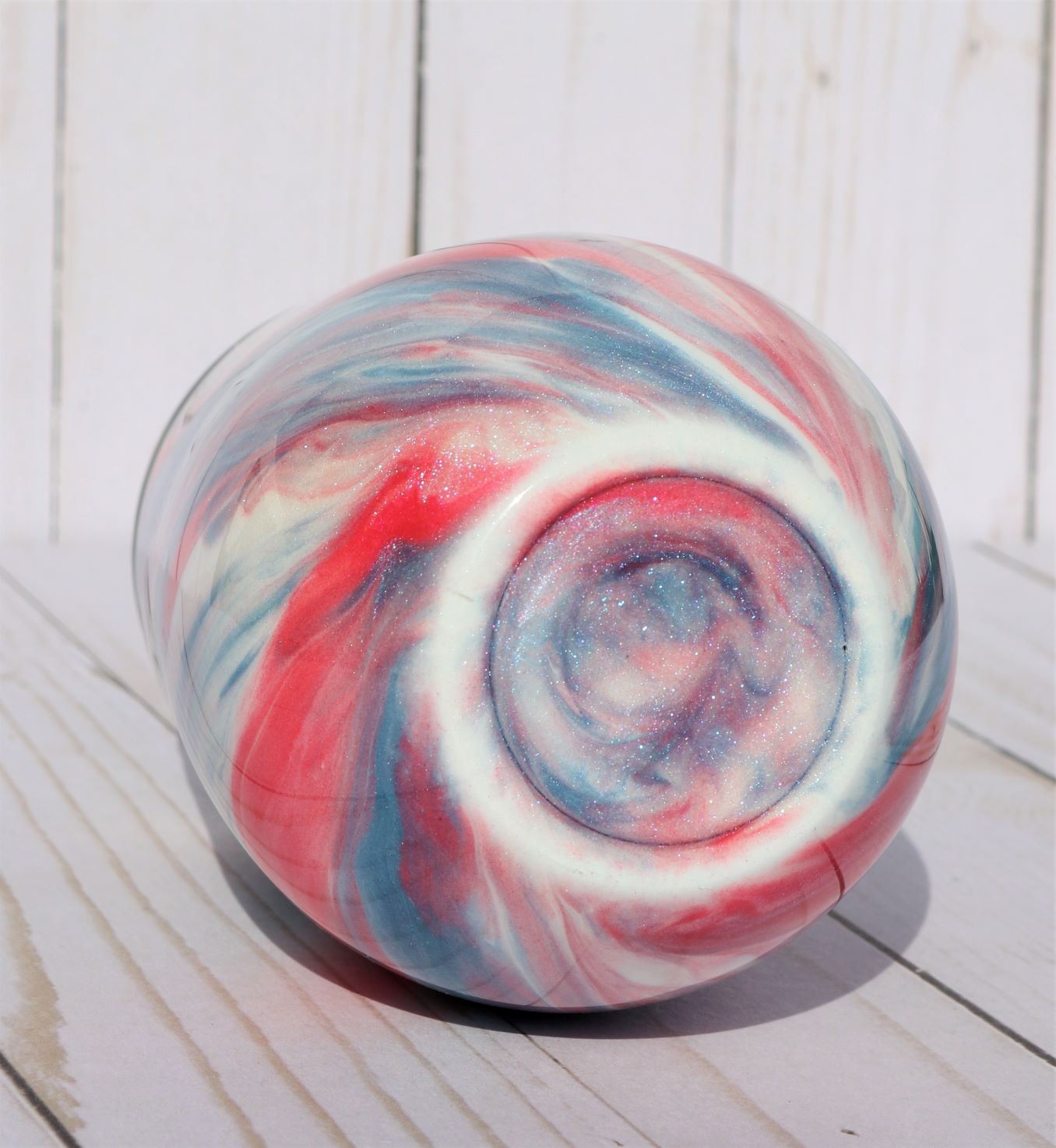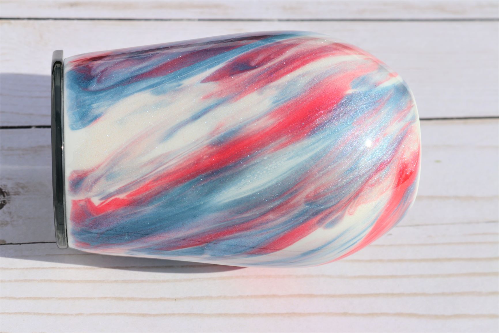 This shimmery tumbler is amazing! Mica is swirled into the epoxy to give the look this tumbler has. After that is done and dry, the tumbler is sanded, decals added, and another layer of epoxy is added to give that smooth glasslike feel.