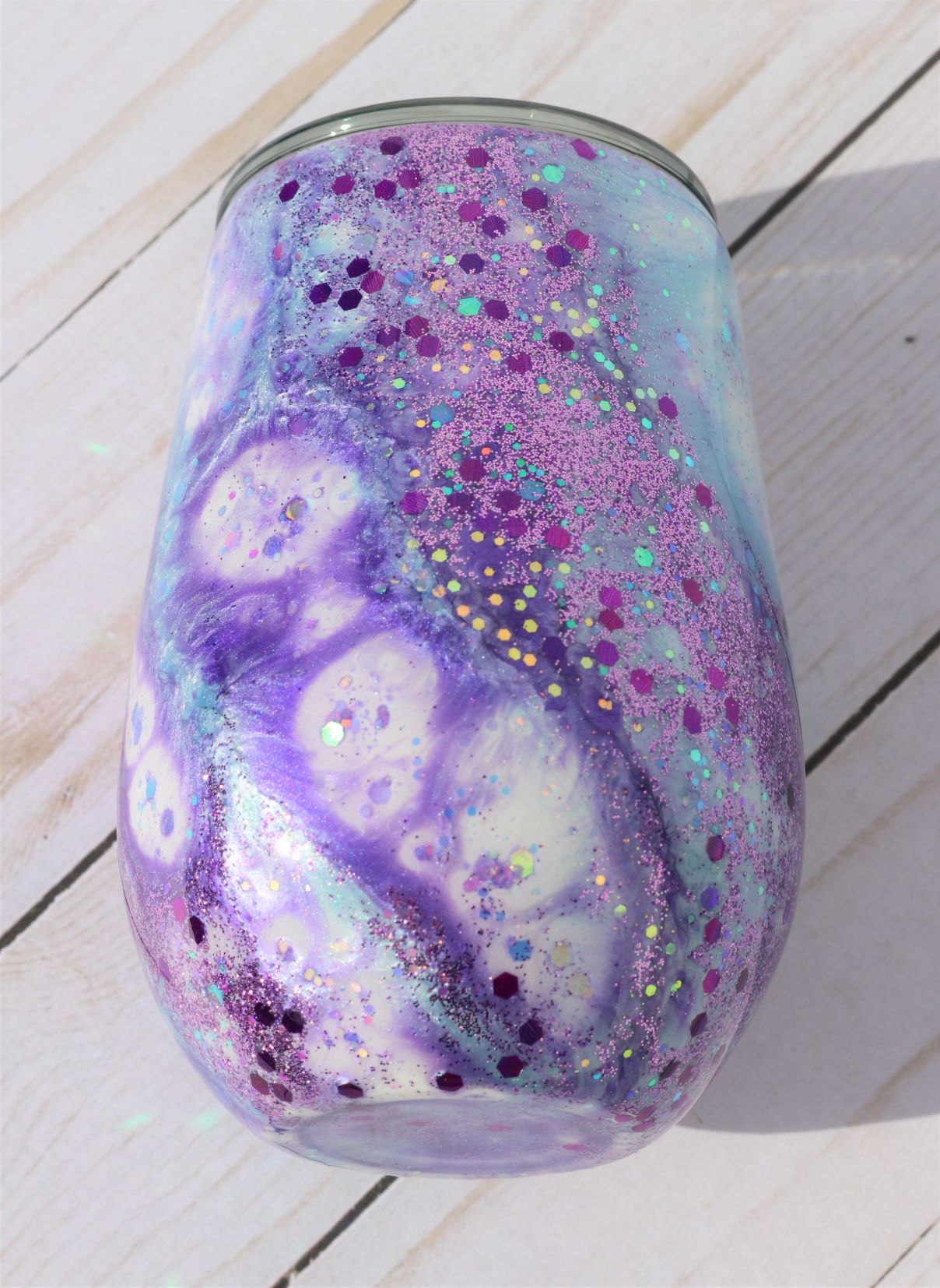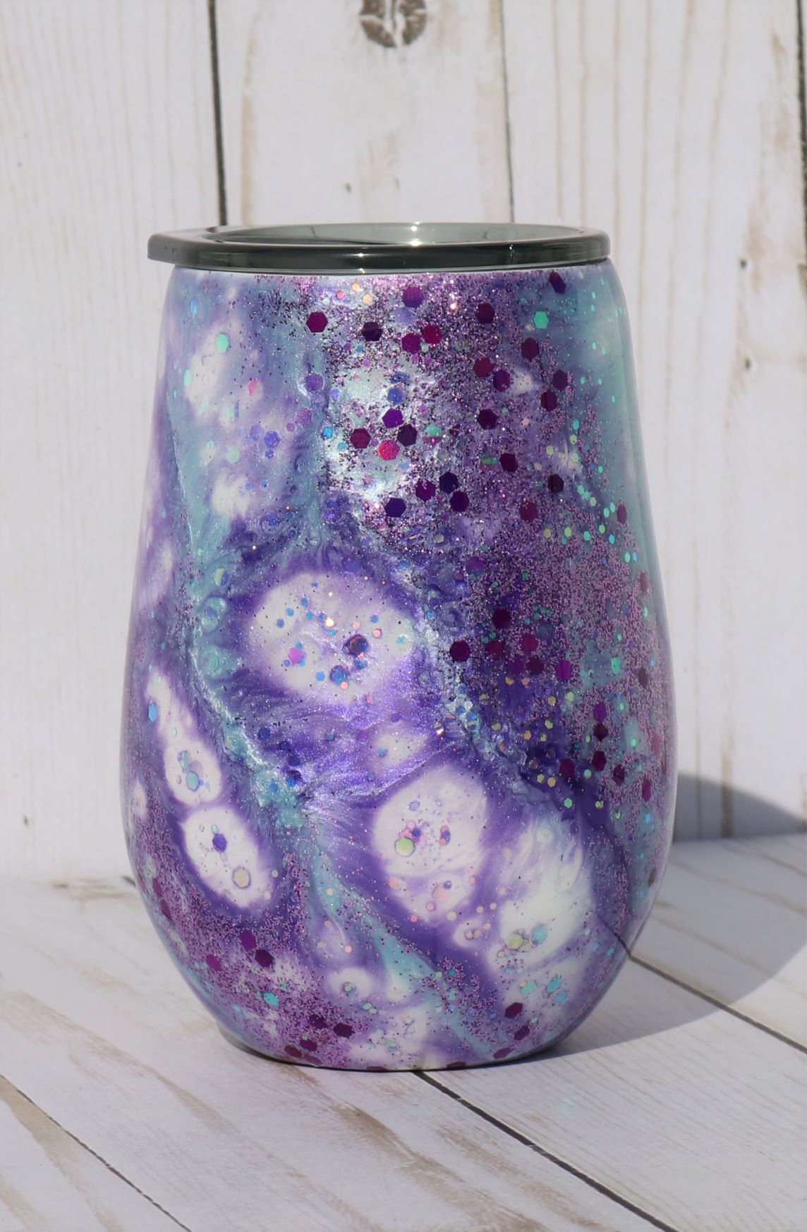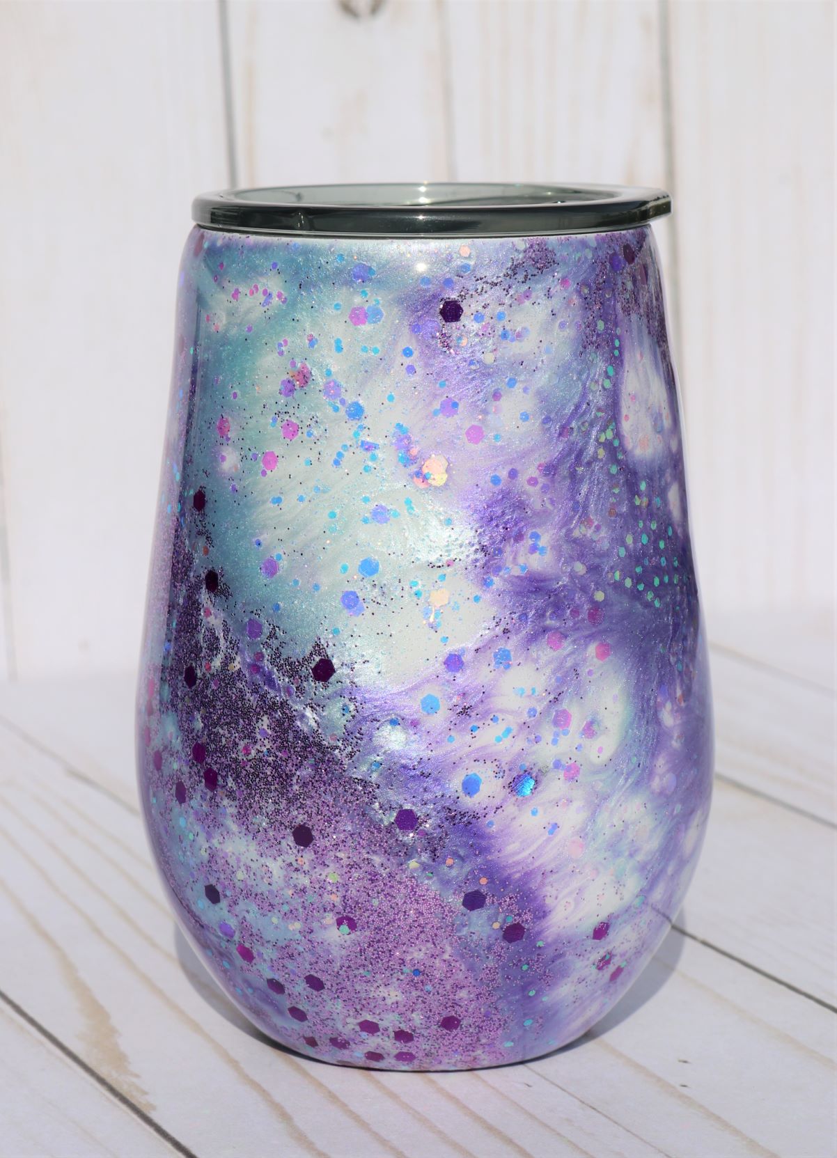 This shimmery tumbler is amazing! Mica and glitter are swirled into the epoxy to give the look this tumbler has. After that is done and dry, the tumbler is sanded, decals added, and another layer of epoxy is added to give that smooth glasslike feel.