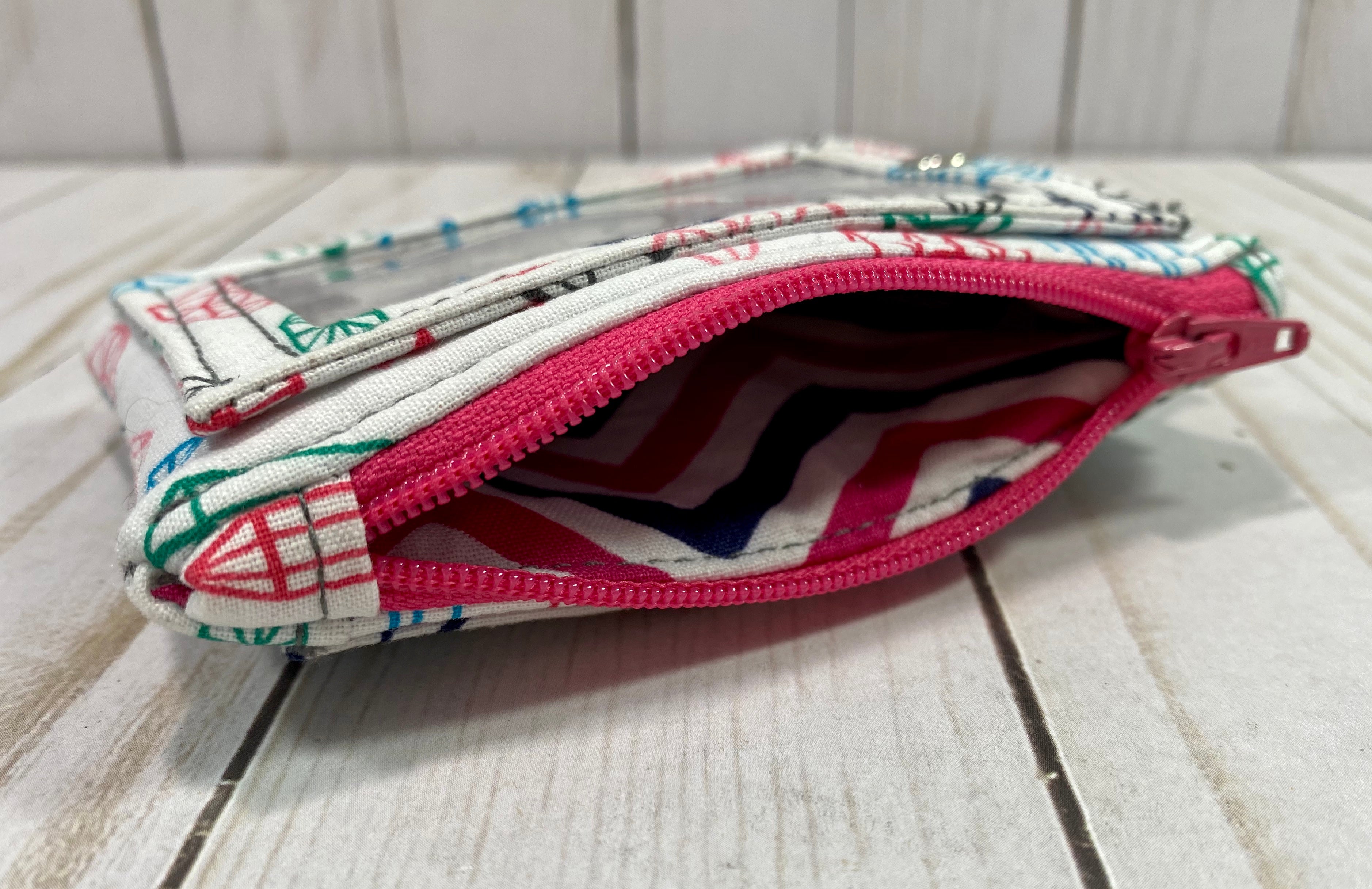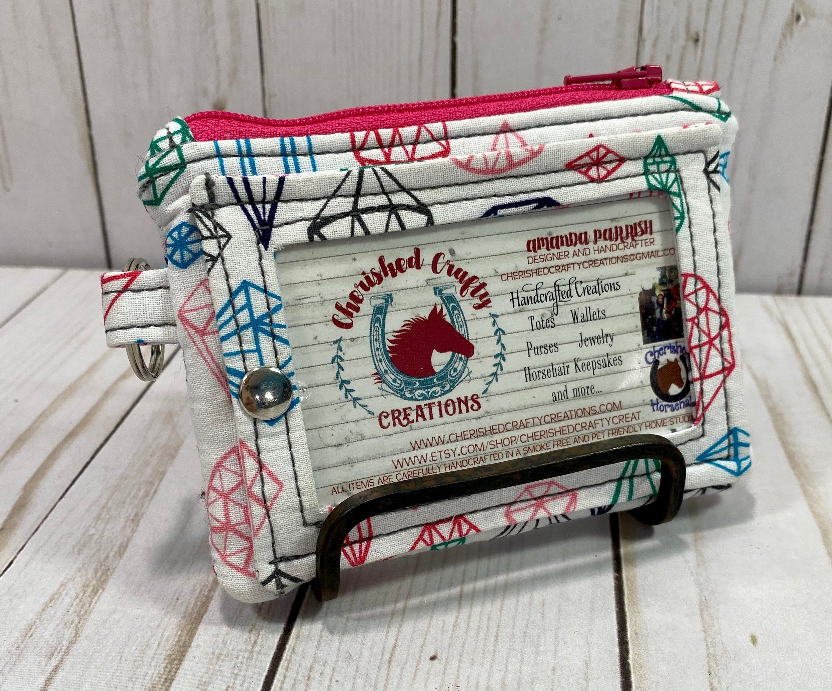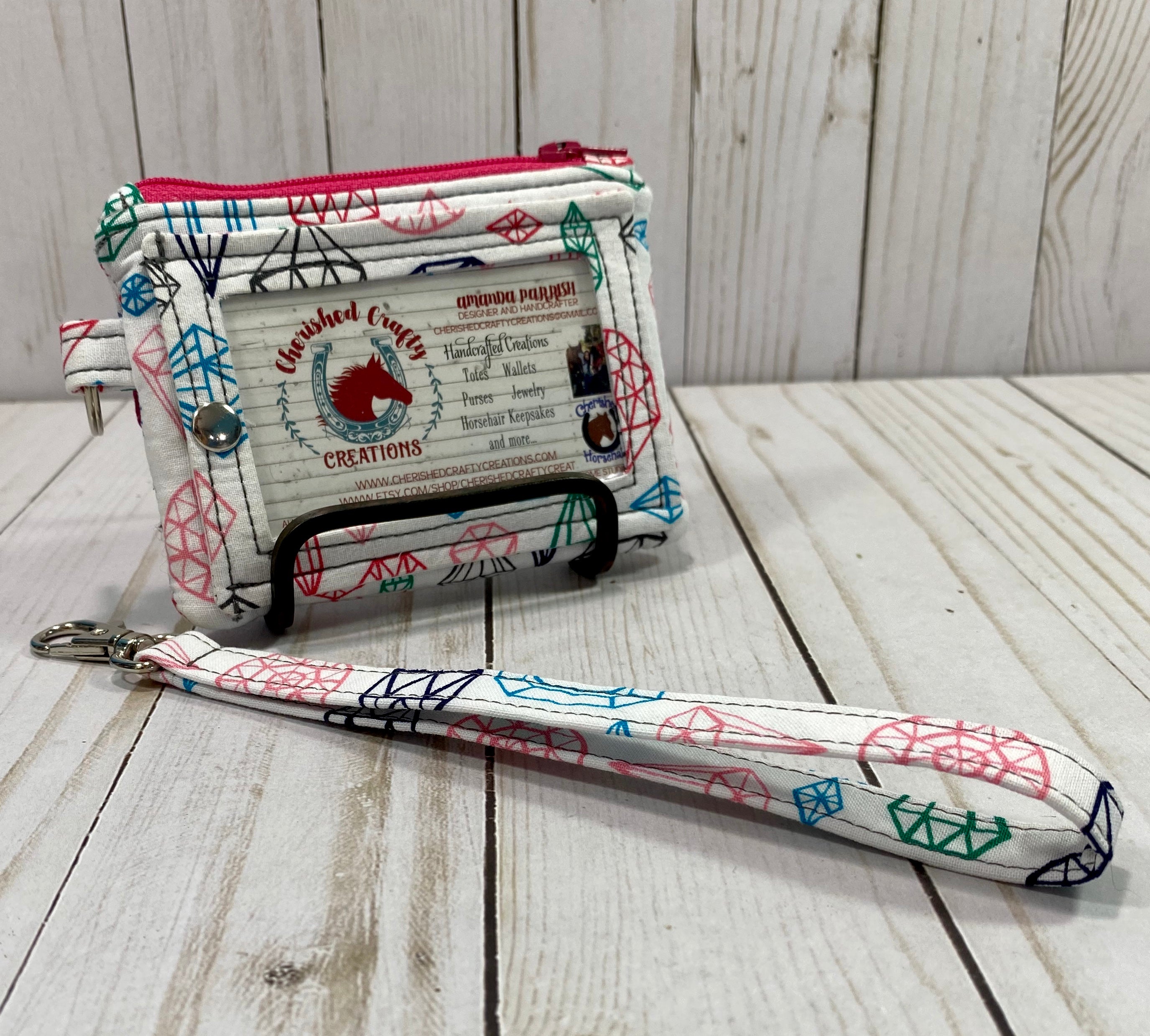The Kristine ID Wallet is great for carrying the essentials. There is a place for your ID that snaps for security, an envelope style flap that snaps close on the other side that protects two slots for cards that can hold a couple each, and then there is the zipper compartment that can hold cash, change, flash drive, chap-stick, or more cards!