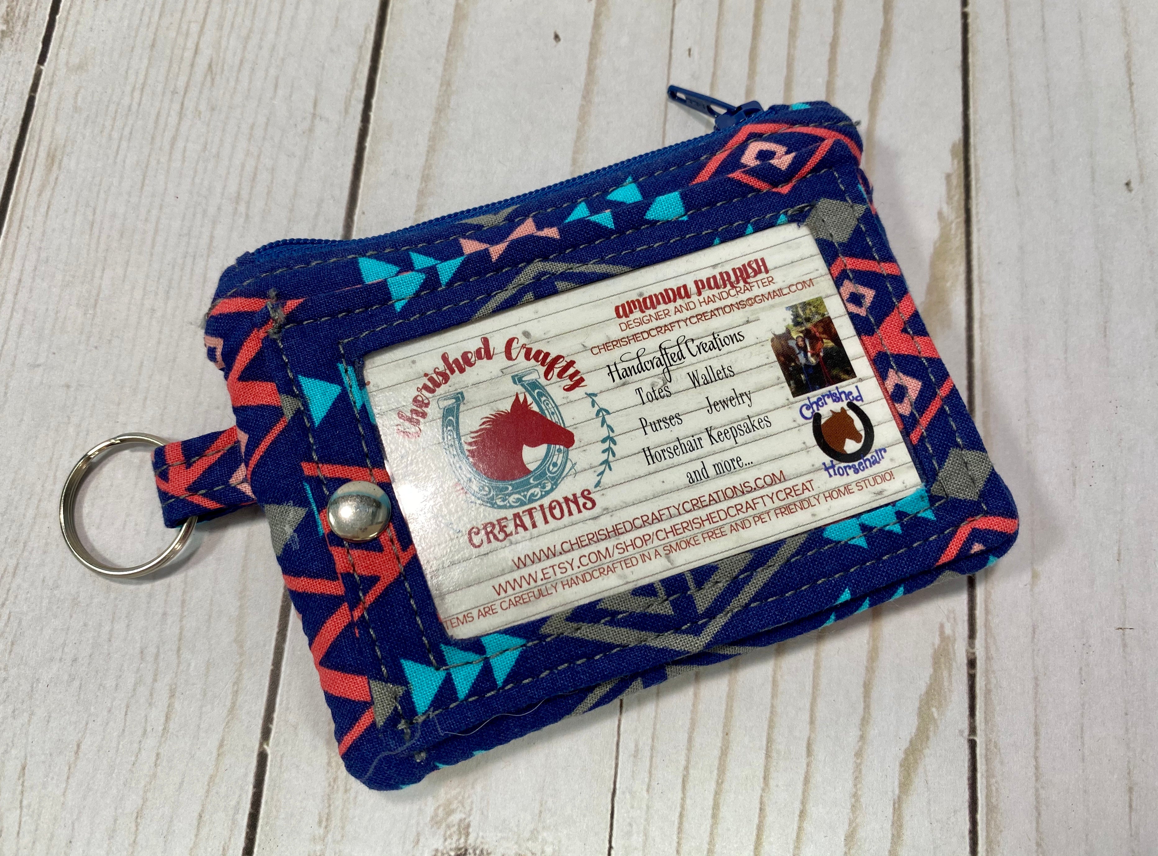 The Kristine ID Wallet is great for carrying the essentials. There is a place for your ID that snaps for security, an envelope style flap that snaps close on the other side that protects two slots for cards that can hold a couple each, and then there is the zipper compartment that can hold cash, change, flash drive, chap-stick, or more cards!