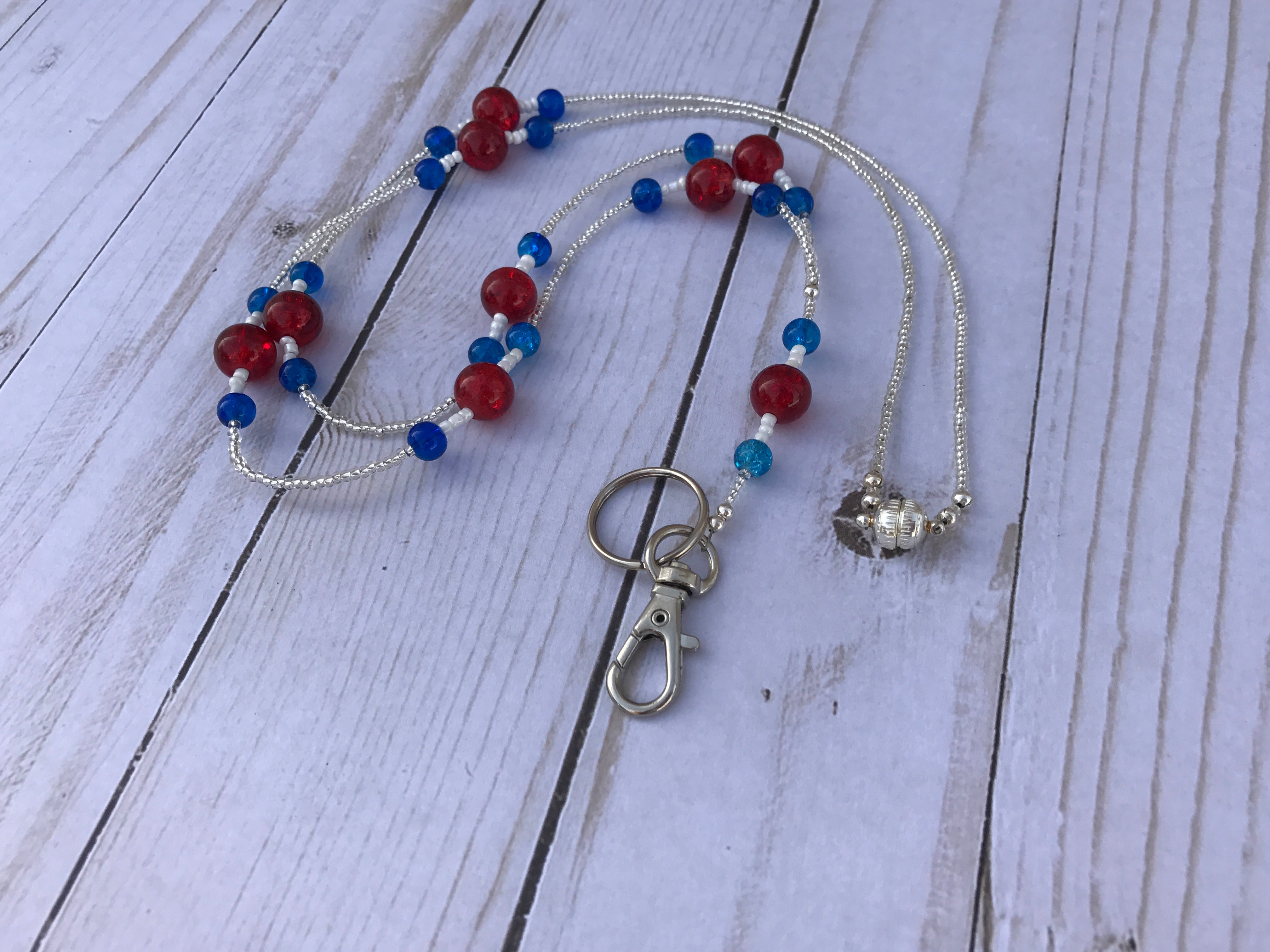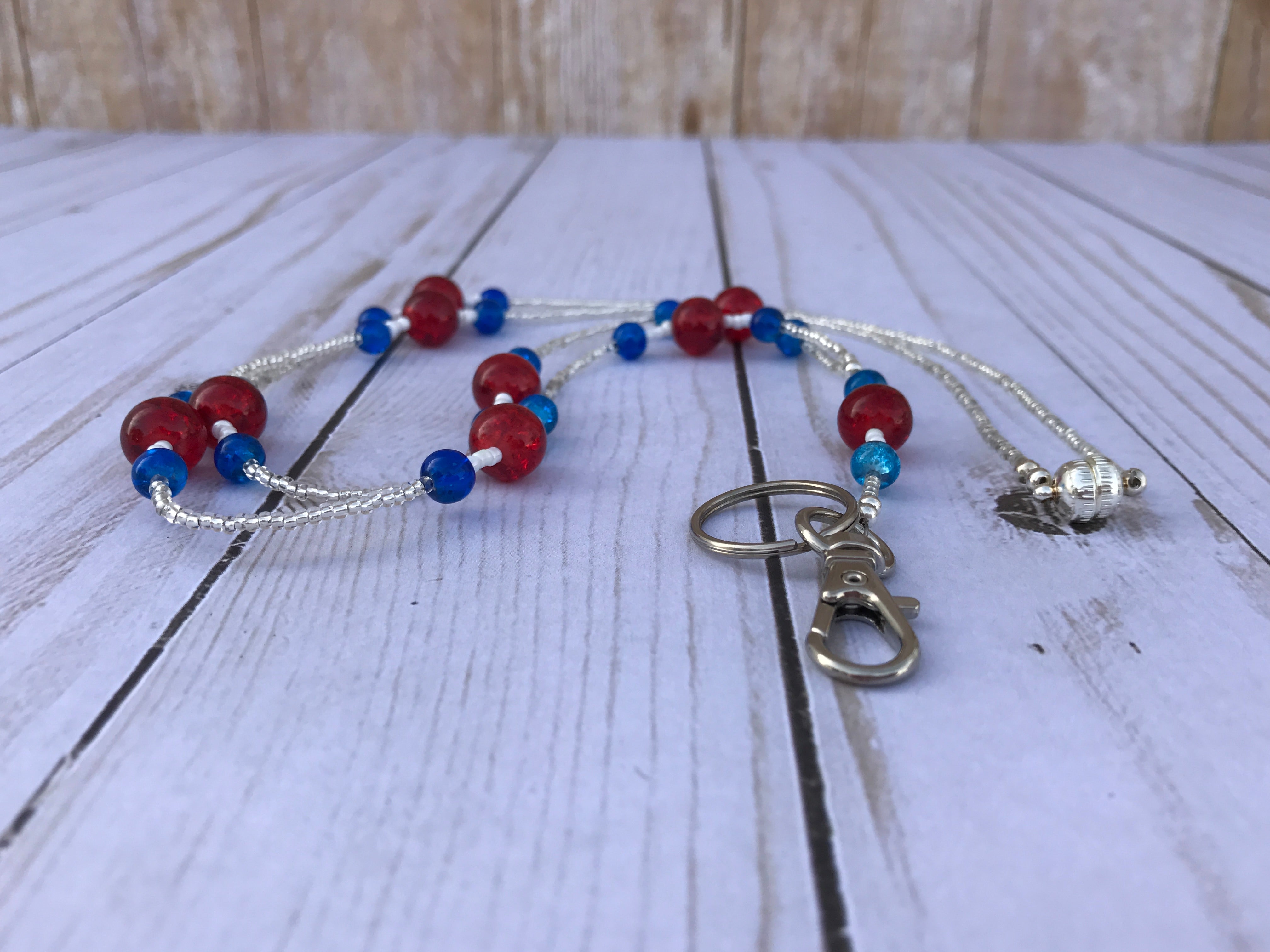 My lanyards are created using a strong beading wire, strong jump rings, and an assortment of seed beads, glass beads, metal beads, and acrylic beads as well as silver toned findings. I double the crimp beads on the stress points to ensure that the lanyard stays strong. Also included is a medium sized split ring attached to the trigger style clasp to hold an ID.