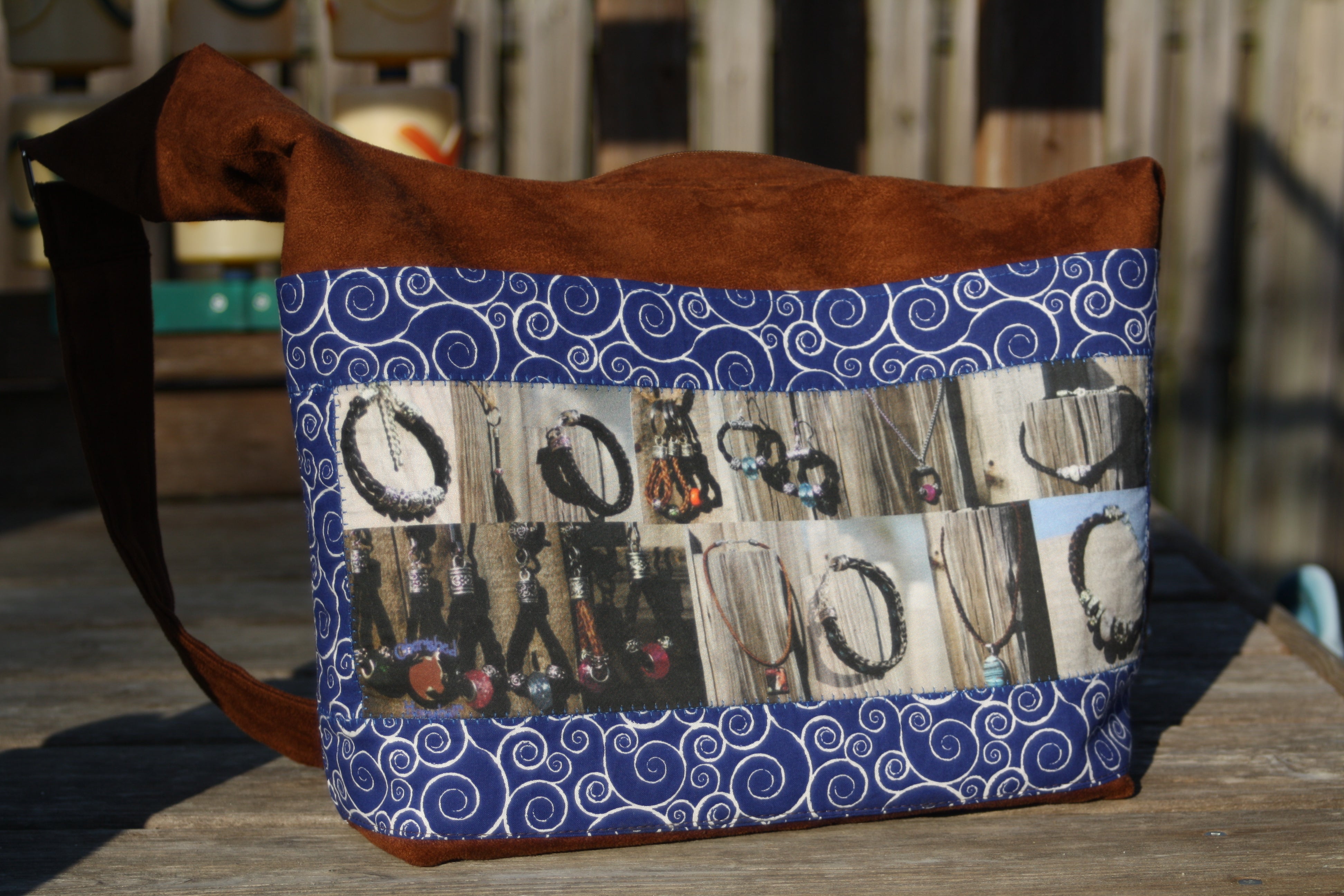 A custom bag can be made with all fabric, fabric and faux leather or vinyl combination on the exterior, or genuine leather and cotton fabric for the exterior. The lining will always be a cotton fabric. The bag has interfacing and fleece for slight padding and strength.